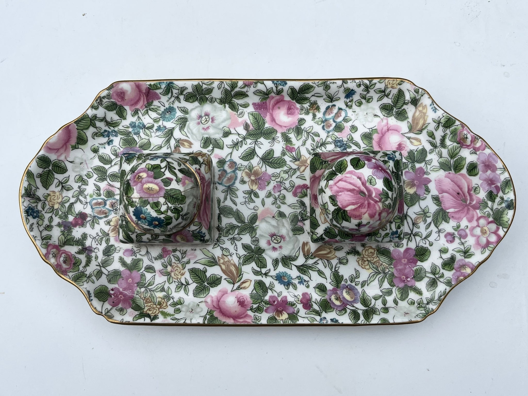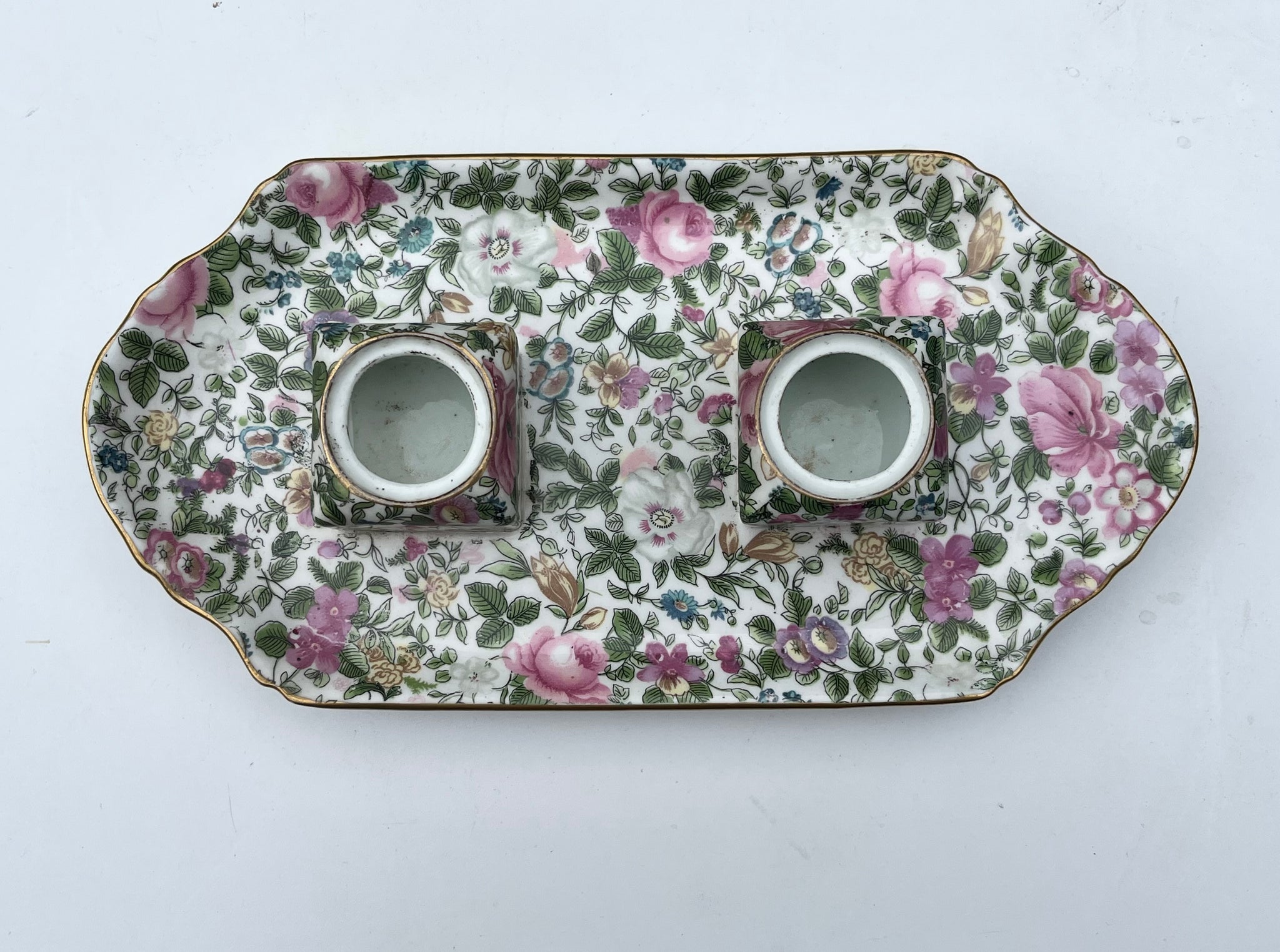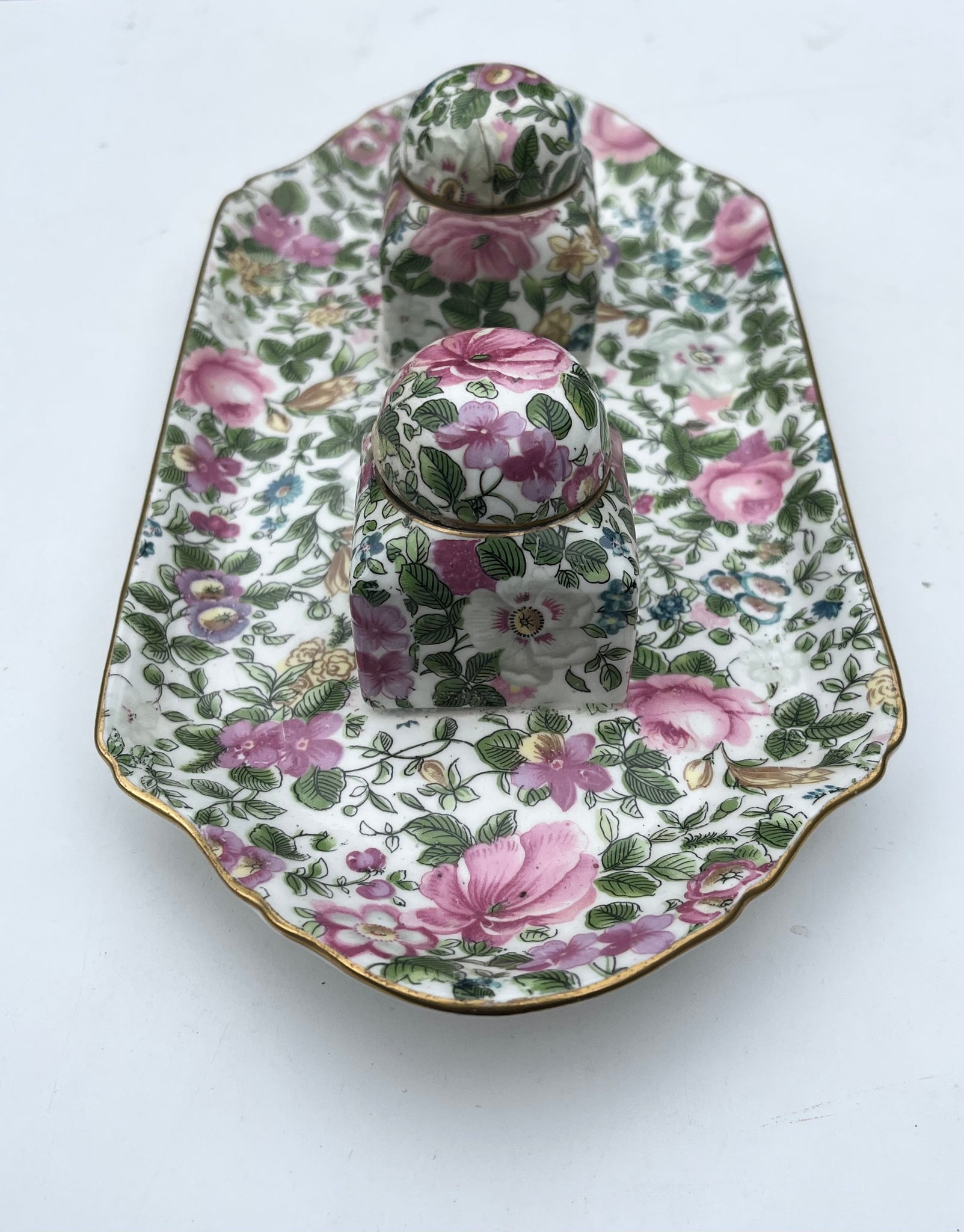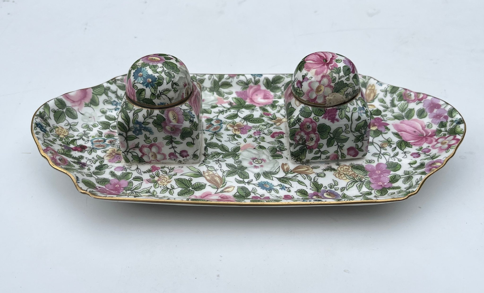 Pair of vintage Crown Staffordshire Thousand Flowers Inkwells attached to tray