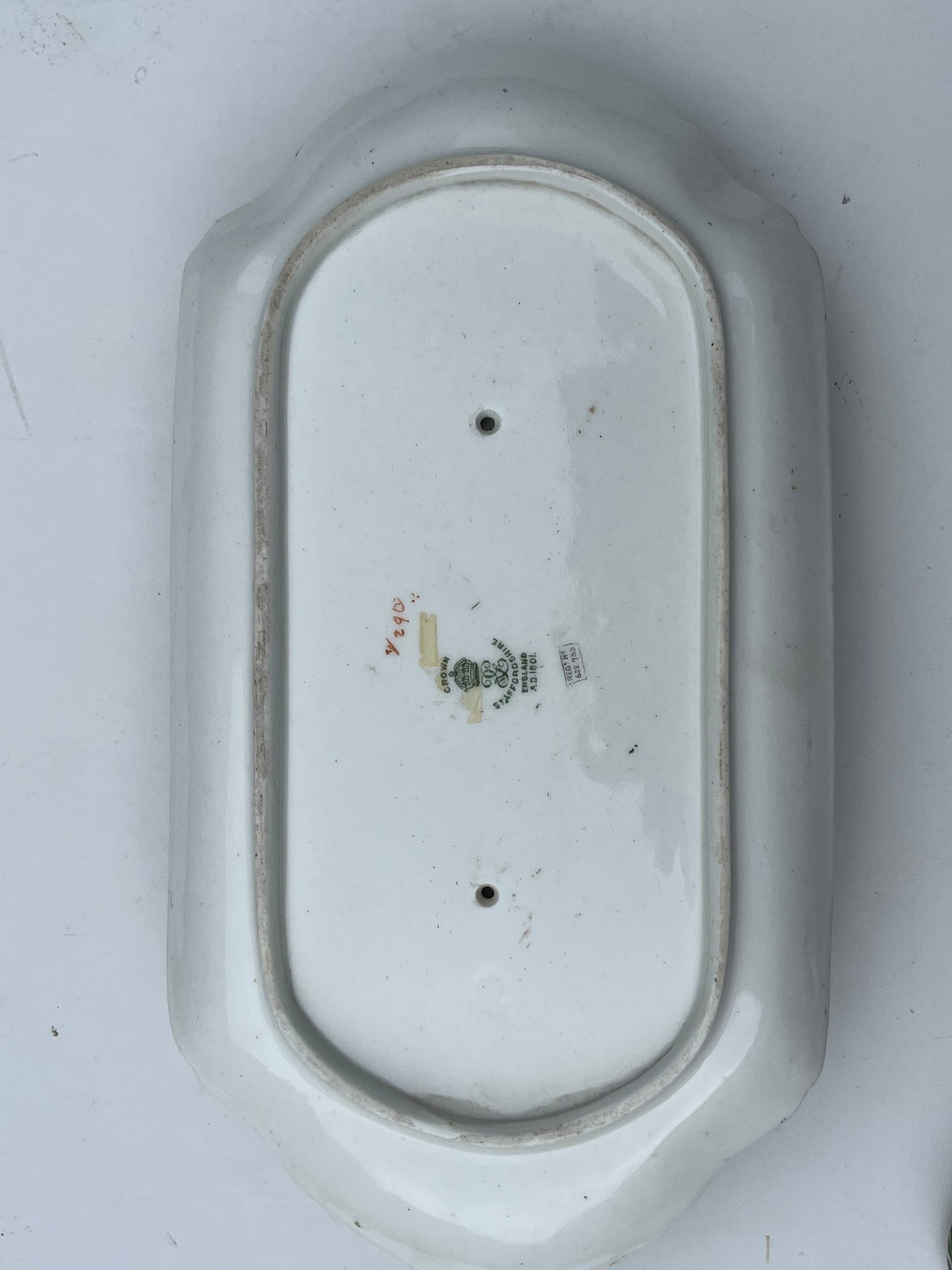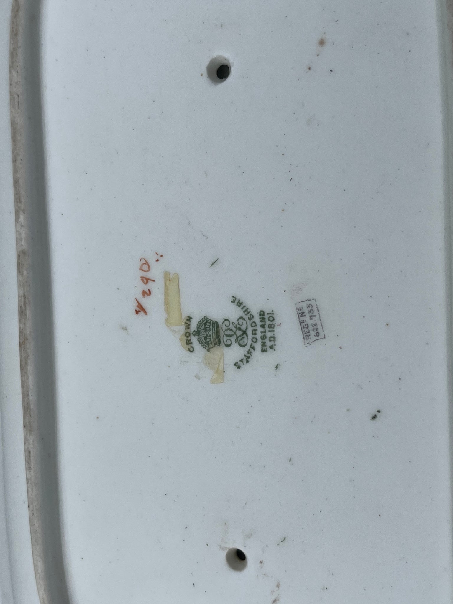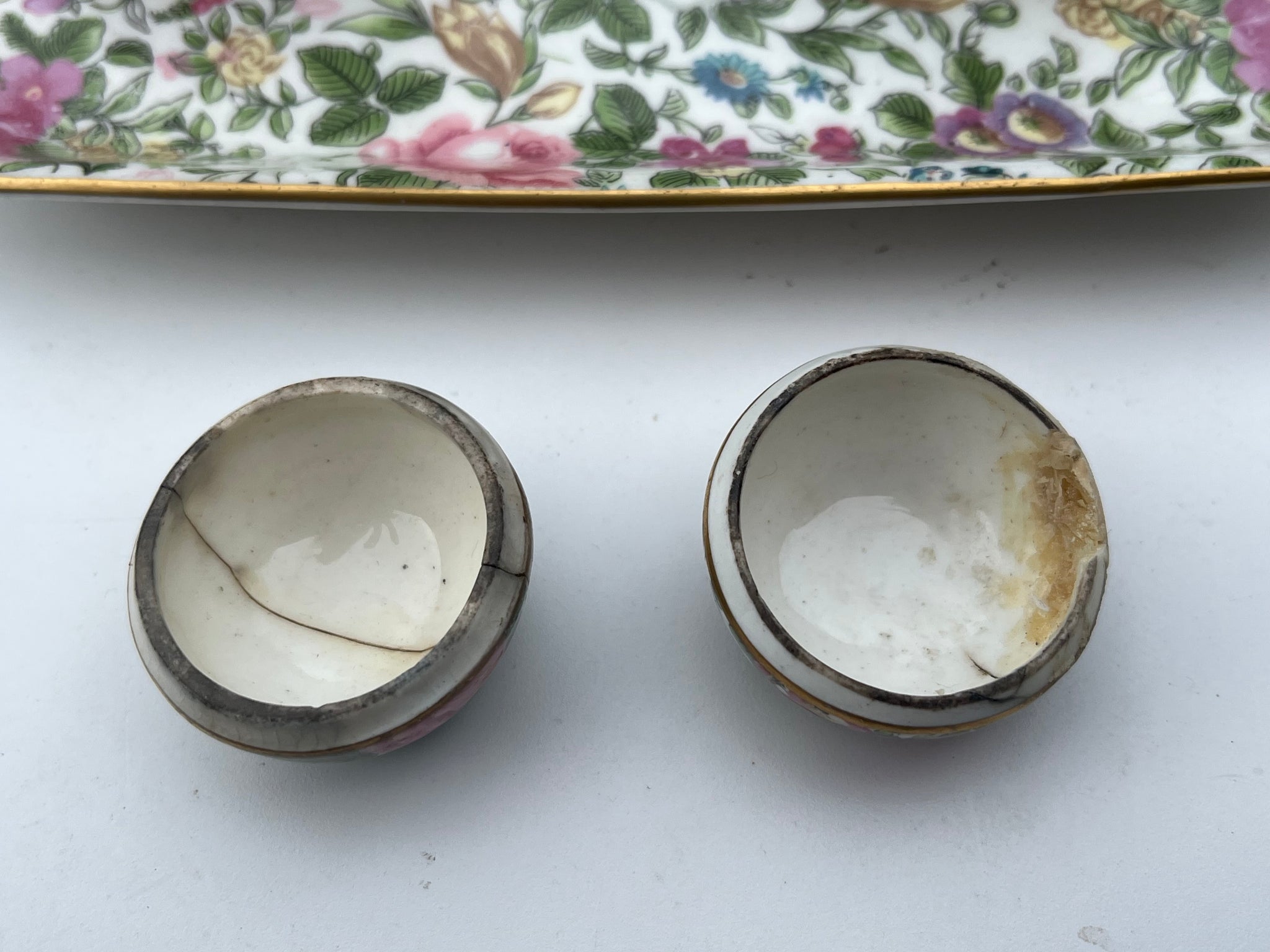 The tray is in overall good condition. The lids however, one has a crack and the other one was been repaired, (amateur repair!) however can to be placed to the back. A charming piece and it's unusual to still be complete given the age.